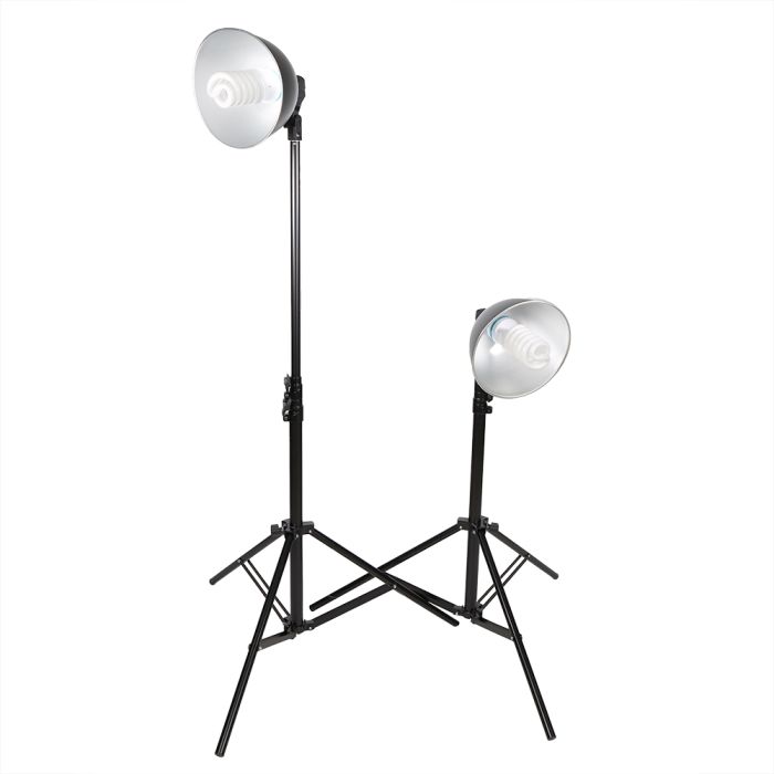 De levering van deze geweldige lichtset bevat alles wat je nodig hebt om aan de slag te gaan: in totaal twee lampfittingen met kabel, twee 85W spiraallampen, twee reflectors met een diameter van 26 cm, twee lampstatieven verstelbaar tot 210 cm, en een handige transporttas. Alles wordt geleverd in een mooie kleurenverpakking om de set compleet te maken.