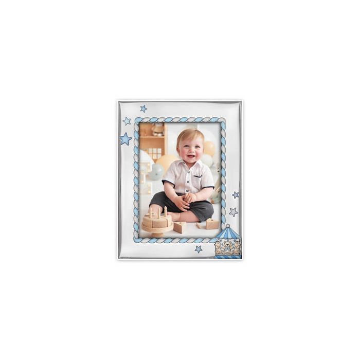 De Federico Blauw is een verzilverde fotolijst voor 10×15 foto’s, versierd met blauwe teddyberen en circusdetails. Het glanzende metaal en de houten achterkant geven een luxe, speelse uitstraling—perfect voor babyfoto’s of als kraamcadeau.