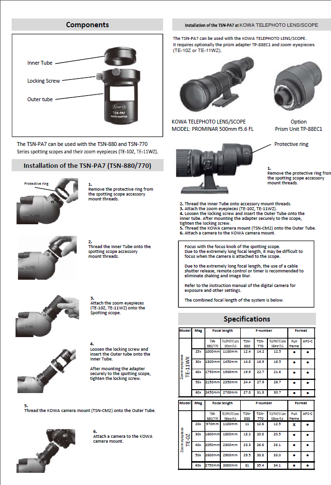 De TSN-PA7A adapter past perfect bij de Kowa TSN-99, TSN-88, TSN-66, TSN-880 en TSN-770 series gecombineerd met een Kowa TE-11WZ of TE-80XW oculair. Beschik je over een Kowa TSN-601, TSN-660 en TSN-82SV series of de TSN 550 serie, dan biedt de TSN-PA8 adapter de oplossing. Deze is ook compatibel met de Kowa High Lander en vele historische modellen.